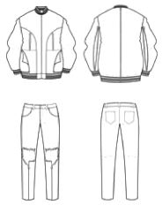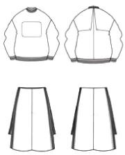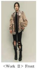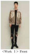 Table 2의 <작품 I>과 <작품 II>는 성수동의 정치·경제·기술적 요인에 따라 구분한 지역적 특성 중 하나인 지역성과 입지성을 반영하였다. 이에 따라 저렴한 임대료로 인해 형성된 준공업 지역에 초점을 맞춰 성수동 지역 산업 종사자들의 워크웨어라는 콘셉트를 설정하여 스카잔 점퍼 스타일의 아우터의 가슴과 등 부분에 실버 니켈 지퍼를 사용한 여유 분량을 주어 디테일을 더해주면서 동시에 활동성을 강조한 트렌디한 스트리트 캐주얼을 디자인하였다.
