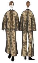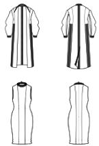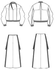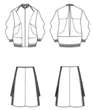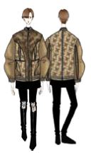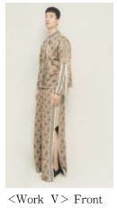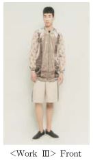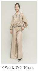 Table 2의 <작품 III>과 <작품 IV>는 성수동의 전통적인 지역 경제인 2차 산업이 창조성을 기반으로 하는 새로운 형태의 3차 산업의 유입으로 인해 사회·문화적으로 복합성을 나타내고 있다는 지역적 특성을 반영하여 스카잔 점퍼 형태의 아우터에서 남성적인 직선적 요소와 여성적인 곡선의 요소를 적절히 사용하여 복합적인 성의 균형을 이루는 유니섹스 룩을 디자인하였다.