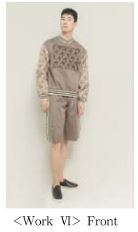 Table 2의 <작품 V>와 <작품 VI>은 오늘날 성수동에 유입되고 있는 창조성을 갖춘 젊은 세대들의 현대적인 감성에 초점을 맞춰 전통적인 지역 경제에서 문화·예술인들에 의해 창조적 경제의 젊고 특색 있는 복합문화공간으로 탈바꿈하고 있는 성수동의 사회·문화적 특성인 복합성에 의해 성수동만의 특색인 빈티지한 거리공간의 느낌을 애슬레저 스타일의 스트리트 캐주얼로 디자인하였다.