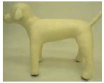 애견더미의 구성소재를 살펴본 결과 소재가 표기되어있는 제품은 조사 제품의 53%이었으며, 그 외에는 소재를 표기하지 않은 채 판매되고 있었다. 주로 사용되는 겉감용 소재는 면과 인조가죽 이였으며, 내부 충전재로는 솜을 주로 사용하고 있었고, 구성비에 대한 표기가 없는 등 정확한 설명이 대부분 부족하였다. 또한, 형태 유지 및 다리의 움직임을 위해 더미 내부에 철사와 알루미늄을 이용한 제품이 있었다.