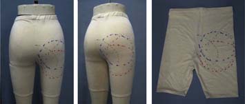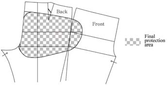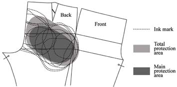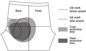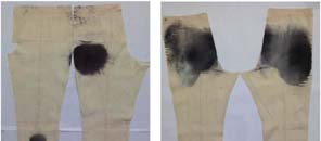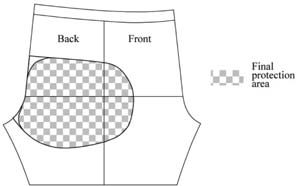 낙상 시 충격보호 위치와 면적에 관한 실험을 통해 가장 보호해야 할 부위와 보호패드의 크기를 선정하고자 가상의 낙상실험을 실시하였다. 선행연구(Park & Lee, 2014; Lee et al., 2014)의 낙상실태 조사결과에서 낙상 시 우선 보호해야 할 부위는 척추의 압박골절 위험이 높은 엉덩이 부위와 고관절 부위로 나타났기 때문에 이를 바탕으로 가상의 낙상동작을 설정하였다. 즉, 낙상실험 시 뒤로 넘어지면서 엉덩이 아래쪽이 바닥에 닿는 동작과 옆쪽으로 넘어지는 동작을 천천히 실시하여 낙상이 발생될 때 충격력이 가해지는 부위를 확인할 수 있도록 하였다. 낙상상황을 만들기 위해 가로 70cm, 세로 100cm의 잉크 스펀지를 바닥에 깔고 연구자가 직접 실험복 바지를 착용한 상태에서 설정된 낙상동작을 실시하여 바닥에 닿는 부위에 잉크가 찍혀질 수 있도록 하였다. 찍혀진 잉크의 면적과 부위, 진한 정도 등을 팬츠 패턴에 표시하고 중합하여 보호 부위와 면적 등을 선정하였다. 본 연구에서 선정한 보호 부위와 선행연구 결과(Park & Lee, 2016)를 팬츠에 중합하고 여러 번의 착의실험을 통해 최종의 보호 부위 및 면적을 선정하였다(Fig. 7).