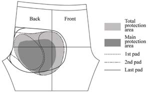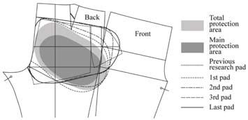셋째, 최종적으로 폼 단일형 패드와 젤폼 복합형 패드를 보호복의 형태에 따라 팬츠형과 속옷형으로 각각 나누어 총 4종의 보호패드를 제작하였다. 주요 보호부위의 패드두께는 8mm로 하여 보호력을 강화시켰으며, 가장자리로 갈수록 5mm, 3mm로 점점 줄어들게 하여 외관과 착용감을 좋게 하였다.