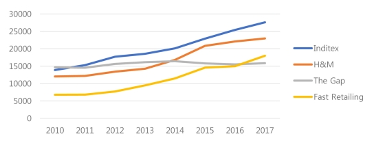 Korea along with Hong Kong and Taiwan was one of the largest exporters of textile and apparel until the 1980s. Since then, however, exports from Korea have decreased while imports have increased due to the rise of Korea’s wage rate and consumer demand to foreign brands. The 1988 Seoul Olympic Games created an interest among the Korean people for foreign brands and an increase in consumption in foreign luxury brands despite the high prices of foreign products. In the 2000s, global fast fashion brands entered the Korean market. For example, Uniqlo entered Korea in 2005, Gap in 2007, Forever 21 in 2008, Zara in 2008, H&M in 2010, and Joe Fresh in 2014. Jeil Industry (now Samsung C&T) had already imported and opened Mango stores in 2001 and 2003 but retreated soon after opening the stores. In 2009, the Mango headquarters in Spain directly entered the Korea market; however, due to its poor sales revenue, only seven stores were left in 2017. Forever 21 has operated only two stores since 2016 after closing a flagship store in Garosoogil, Seoul. Uniqlo, Zara, and H&M had high annual growth rates at the early stage after entering the Korean market; however, they also had slow or negative growth rates later.