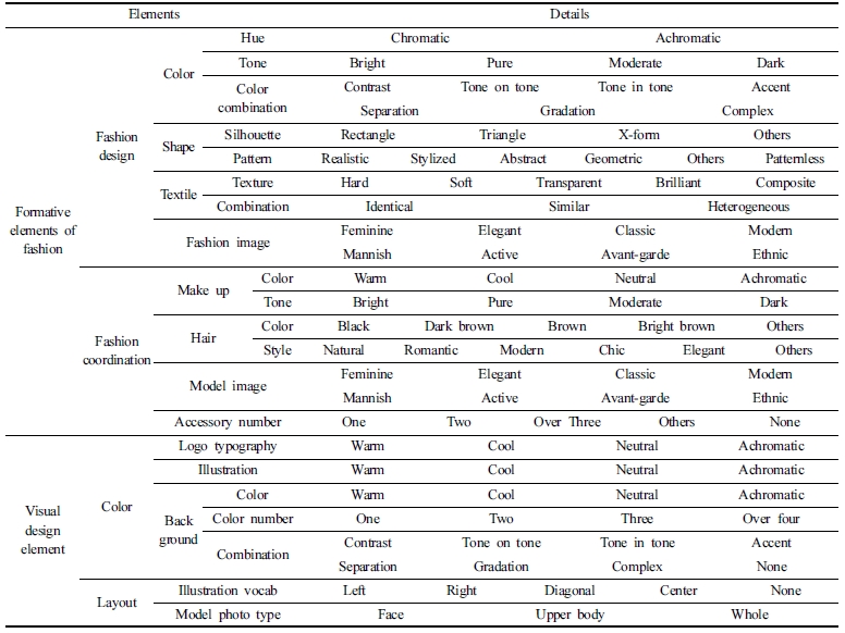 자료 분석기준은 크게 모델의 패션을 중심으로 한 조형적 요소와 잡지표지의 배경에 해당하는 시각디자인 요소로 구분하여 구성하였다. 패션의 조형적 요소는 패션디자인요소와 패션연출요소로 구성하였다. 패션디자인요소는 패션디자인에 관한 문헌(Lee et al., 2012)을 참고로 하여, 색채(색상, 톤, 색채조합), 형태(실루엣, 무늬), 소재(재질감, 재질조합), 패션이미지 등으로 구성하였다. 패션연출요소는 패션연출에 관한 문헌(Lee & Lee, 2017)을 참고로 하여 메이크업(색상, 톤), 헤어(색상, 스타일), 모델이미지, 액세서리 수 등으로 구성하였다. 또한, 패션잡지 표지디자인의 패션에 관한 선행연구들(Jo, 2011; Kim, 2007)에서 공통적으로 사용되고 있는 요소들을 참고로 하여 선정하였다. 시각디자인요소는 선행연구들(Moon, 2016; Park & Kim, 2015; Song & Byun, 2015)을 참고로 하여 주로 많이 사용된 요소인 색채(로고 타이포그래피, 일러스트레이션, 배경)와 레이아웃(일러스트레이션 어휘와 모델 사진 유형)으로 구성하였다. 패션잡지 표지의 분석기준은 Table 1과 같다.