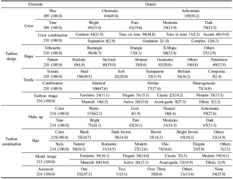 패션연출에서 살펴보면 메이크업에서 색채는 난색계열이 가장 많이 나타났고, 그 다음이 무채색계열, 중성색계열 순으로 나타났다. 톤은 밝은 톤, 어두운 톤, 화려한 톤, 수수한 톤 순으로 많이 나타났다. 헤어의 색채는 밝은 브라운, 블랙, 브라운, 기타, 다크 브라운 순으로 많이 나타났다. 헤어스타일은 시크가 가장 많이 나타났고, 내추럴, 로맨틱, 모던, 엘리건트, 기타 순으로 많이 나타났다. 모델이미지는 매니시가 가장 많이 나타났고, 그 다음이 페미닌과 모던, 아방가르드, 엘리건트, 액티브, 클래식, 에스닉 순으로 나타났다. 액세서리는 1가지가 가장 많이 나타났고, 그 다음이 없음, 기타, 3가지 이상, 2가지 순으로 높게 나타났다.