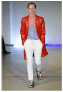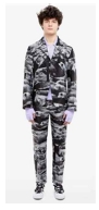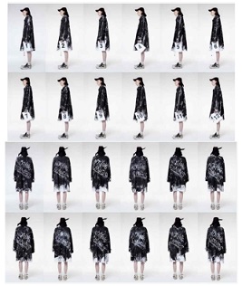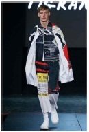 작품의 색상은 루브친스키와 마찬가지로 블랙, 그레이, 화이트 중심의 무채색을 기본적으로 사용하고, 부분적으로 고채도와 고명도의 특징적인 컬러를 매치함으로써 시각적인 단조로움을 회피하고 있다. Pic. 25를 보면 아우터로 착용한 코트는 다양한 패턴이 프린팅되어 있지만, 그 무늬의 색상과 바탕색을 블랙과 그레이를 사용하여 지나치게 화려하지 않도록 하였으며, 부분적으로 명도와 채도가 높은 핑크, 옐로우, 그리고 네이비 컬러를 넣어 시각적 흥미를 살리고 있다. 아울러, 화려한 코트에 포인트를 주기 위하여 하의인 팬츠와 슈즈 등을 블랙 컬러로 통일하여 안정감을 주도록 하고 있다. 이러한 컬러 사용 방식은 특정한 컬러에 치우치지 않도록 하는 균형감 있는 컬러 조합이라고 할 수 있다.