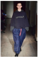 루브친스키와 아베티샨의 작품에는 집단적 정체성 이외에도 개인의 가치관을 드러내는 ‘개성의 표출’이라는 특성도 나타났다. 이는 최근에 화제가 되었던 YOLO(You Only Live Once) 열풍에서도 알 수 있듯이 현재 젊은이들이 집단의 가치관보다는 개인적인 지위와 행복에 더욱 집중하고자 하는 오늘날의 유스컬처의 특성이라고 할 수 있다. Pic. 42에서 볼 수 있듯이 아베티샨의 2015년 F/W 컬렉션에서는 반소매의 원피스 또는 쇼트팬츠에 어그부츠를 매치하였고, pic. 43을 보면 루브친스키는 2018년 S/S 컬렉션에 셔츠에 니트를 레이어드한 상의 또는 퍼 소재의 집업에 쇼트팬츠를 매치함으로써 계절에 맞지 않는 부조화된 착장 방식을 보였다. 또한 pic. 44의 아베티샨 2015년 S/S 컬렉션에서는 모델이 가방 대신 옷을 담은 반투명 쇼핑백을 손에 들고 등장하는 새로운 패션 스타일을 제시하였고, pic. 45에서 볼 수 있듯이 루브친스키의 2016년 F/W 컬렉션에서는 티셔츠의 소매, 바지 밑단, 벨트 등이 이중으로 된 디자인을 선보임으로써 자신만의 독특한 개성을 적극적으로 표출하고자 하는 청년들의 가치관을 나타내었다. 이러한 작품을 통해 오늘날 청년들이 타인의 시선을 신경 쓰기보다는 개인적인 취향과 의견을 더욱 중시하는 유스컬처의 특성을 알 수 있다.