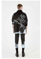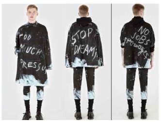 지배적인 기성문화에 대한 반항과 사회 문제에 대한 비판의식으로서 ‘저항성’을 볼 수 있다. 이 저항성은 과거부터 현재에 이르기까지 청년들을 대표하는 가장 주요한 특성으로서 변화와 혁신을 이끄는 원동력이 되어왔다. Pic. 33, 34, 그리고 35를 보면, 아베티샨은 그의 2012년 CSM 졸업패션쇼에서 ‘NO JOBS’, ‘STOP DREAMS’ 등의 문구를 초크로 레터링한 아이템을 선보이면서 청년들이 겪는 미래에 대한 불안감과 사회에 대한 불신을 표현하고자 하였다. 그리고 pic. 36과 37을 보면, 2017 S/S 컬렉션 전체의 룩이 큰 변화 없이 동일한 색상과 소재 및 스타일로 구성이 되어 있는데, 이는 늘 새로운 것을 추구하며 빠르게 변화하는 패션계에 대한 저항을 표현한 것이다. 이처럼 기성세대나 사회에 대한 불만을 직접적인 메시지로 나타내거나 때로는 기존과는 다른 새로운 방식으로 저항성을 표출하는데, 이것은 유스컬처를 반영하는 흥미로운 디자인적 요소로서 활용되고 있다.