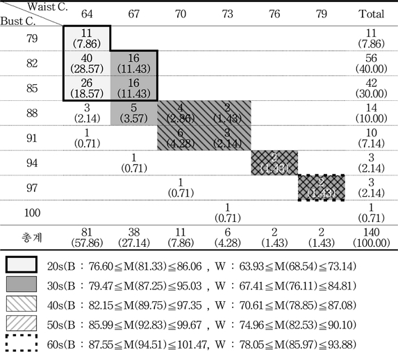 국내에서 생산되고 있는 드레스폼의 성인 여성 치수 반영률을 살펴보기 위해 국내 드레스폼의 ‘가슴둘레’와 ‘허리둘레’를 KS규격 ‘성인 여성복의 치수’의 간격에 따라 각각 3 cm 간격으로 나타내고, 성인 여성의 연령대별 평균 ±1σ에 해당하는 구간을 표시하였다(Table 7). 그 결과, 국내에서 생산되고 있는 드레스폼의 치수는 20대 체형에 해당되는 국내 드레스폼 제품의 빈도가 77.86%로 가장 높은 빈도를 나타내었고, ‘30대(40.00%)’, ‘40대(13.57%)’, ‘50대(2.86%)’, ‘60대(1.43)’ 순으로 사이즈의 범위가 반영되고 있었다. 따라서 국내 드레스폼의 분포는 주로 20대의 체형에 밀집되어 있는 것을 알 수 있었고, 특히 ‘40대’, ‘50대’, ‘60대’의 체형을 커버할 수 있는 드레스폼의 생산 빈도가 적으므로 다양한 연령층의 의류 패턴 제작을 위해서는 연령대별 인대 개발이 필요할 것으로 사료된다.