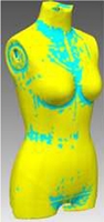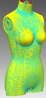 3차원 형상을 이용하여 스포츠 브래지어를 제작하는데 사용된 방법은 다음과 같다. 3D 스캐너(Konika Minolta VIVID 910, Japan)를 이용하여 산업용 표준 사이즈 인대를 스캔하였다. 3차원 스포츠 브래지어 디자인 및 패턴은 스캔한 인대 형상을 Geomagic Design X(3D Systems, Korea) 프로그램으로 불러온 다음 3차원 형상의 평균 곡률(Mean curvature)과 서피스(Surface) 정보를 이용하여 메쉬 형상 위에 3D 메쉬 스케치(3D mesh sketch) 툴을 이용하여 디자인 라인을 형성하였다. 다음으로 메쉬 툴에서 트림(Trim by curve) 기능으로 인대의 3차원 표면을 디자인 라인에 따라 분할하고, 각각의 분할된 면을 정렬하여 3D 형상을 2D 패턴으로 변환할 수 있는 2C-AN 프로그램으로 연결하였다. 2C-AN 프로그램 내에서 Triangle Simplification에 의하여 2차원으로 평면화한 패턴은 Yuka CAD(Youth hitech, Japan) 프로그램으로 다시 보낸 다음 누드 패턴으로 조합하였다. 원단의 신장율을 ASTM D 2594의 방법에 준하여 Ziegert and Keil(1988)의 방법으로 측정하고 적용 신장율을 패턴에 반영하여 축소 패턴 및 시제품을 제작하였다.