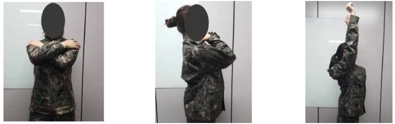 개발방한복 내 · 외피의 동작적합성 평가는 일반동작과 전투동작으로 구분하여 평가하였으며, 일반동작 형태는 선행연구인 남군 방한복 패턴개발(Han & Han, 2018)과 동일하게 총 12개의 항목으로 바로 선 자세 1개, 목관절 굽힘, 목관절 회전, 목관절 외전 동작을 포함하는 목 관련 동작 3개, 어깨관절 90° 굽힘, 어깨관절 180° 굽힘, 어깨관절 90° 외전, 팔꿈치 최대 굽힘, 어깨 뒤로 최대 굽힘, 양쪽 어깨 굽힘 동작을 포함하는 팔 관련 동작 6개, 몸통관절 최대 앞 굽힘, 다리 양옆 최대 벌리기 동작을 포함하는 몸통 관련 동작 2개의 항목으로 구성하였다. 전투동작은 연속동작(Consecutive motion)에서는 서서던지기(연속동작1), 높이뛰기(연속동작2), 팔동작 몸통받쳐(연속동작3), 응용포복(연속동작4)의 4가지 동작으로 구성하였으며, 정지동작(Static posture)에서는 서서던지기-던진 후 왼팔 올림(동작1), 엎드려쏴(동작2), 팔동작몸통받쳐-엉덩이올리고 한쪽 다리굽힌상태(동작3), 응용포복-어깨 신전(동작4), 응용포복-어깨 내전(동작5), 찔러총–총을 들고 앞으로 내민 자세(동작6)로 총 6개의 동작으로 구성하였다(Table 2). 동작적합성은 착용평가자가 수행할 동작을 3번 반복한 후 편한 정도에 대해 5점 리커트 척도로 평가하였다. 전투동작의 경우, 자세 및 동작 교육을 평가전 선행하고 30분간의 연습과정을 거친 후, 본 평가에 임하였다. 현방한복과 개발방한복의 적합성 비교를 위해 SPSS 20.0 for Window를 활용하여 기술통계와 항목별 유의차를 살펴보기 위한 t-test를 실시하였다.