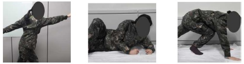 여군 개발 방한복 1차 패턴의 동작적합성은 평가는 일반동작과 전투동작으로 구분하여 평가하였으며, 평가결과는 Table 8, Table 9와 같고, 주요동작의 이미지와 평가 시 착장형태는 Table 10과 같다.