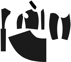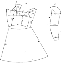 프락의 패턴은 Fig. 5와 같이 앞몸판, 뒤몸판, 스커트로 구성되며, 뒤몸판은 매우 좁다. 스커트 길이가 몸판보다 길며, 밑단을 확장하여 플레어를 형성하고, 몸판과 스커트의 허리선이 곡선으로 허리를 매우 밀착시키고 있다.