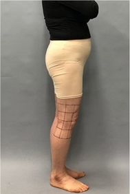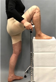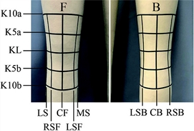 무릎은 체표 기준선이 표시된 측정용 타이즈를 착용한 상태에서 수성펜으로 행과 열의 교차점들을 표시하였다. 타이즈를 탈의 후 인체에 표시된 점들을 아이라이너로 연결하여 행과 열의 체표기준선을 완성하였다. 엉덩이 · 고관절은 직접 체표에기 준선을 표시하기 어려운 부위라서 인체를 압박하지 않으면서 신축성이 좋고 밀착되는 3부 길이의 측정복을 바디에 입혀 체표 기준선을 그린 후 이를 피험자에게 착용시켜 측정을 진행하였다.