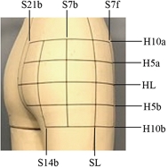 90°로 무릎을 굽히는 동작에서는 옆선과 앞쪽 체표의 세로선은 크게 수축하고, 엉덩이선(HL)을 기준으로 엉덩이 뒤쪽으로 갈수록, 아래쪽으로 내려갈수록 체표면의 신장률이 크게 나타났다.