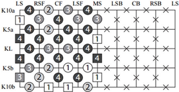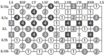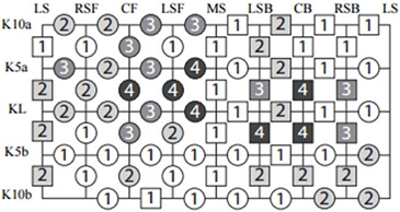 동작에 따른 무릎의 가로 체표기준선의 변화량을 열별로 분산분석한 결과, LS-RSF구간과 LSF-MS구간에서 p < .001 수준에서 유의한 차이가 나타났다. LS-RSF구간은 무릎의 바깥쪽 옆선(LS)에서 중심을 향한 첫 번째 가로구간이며, LSF-MS구간은 무릎의 안쪽 옆선(MS)에서 중심을 향한 첫 번째 가로구간이다. 이와 같은 결과를 통해 무릎의 중앙보다 앞옆선과 옆선 사이 구간에서 동작에 따른 각도별 체표변화가 뚜렷하게 증가하는 경향을 알 수 있다(Table 11).