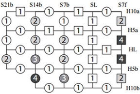동작에 따른 고관절 가로 체표기준선의 열별 길이 변화를 관찰한 결과, S21b-S14b구간을 제외한 모든 구간에서 무릎을 많이 굽히는 동작을 할수록 고관절 가로 기준의 길이가 전반적으로 증가하는 경향을 보였다(Table 15). Duncan test 결과, 특히 S7b-SL구간에서 뚜렷한 치수 증가를 보였는데, 이로써 무릎을 굽히는 각도가 커질수록 엉덩이 옆선(SL)에서 7 cm 뒤쪽까지의 가로 체표길이가 많이 늘어난다는 것을 알 수 있다. 반면, S21b-S14b구간에서는 유의한 차이가 나타나지 않았는데, 이는 Table 9에서 살펴본 바와 같이 엉덩이선 위쪽으로 일부 구간에서 수축이 일어나고, 아래쪽으로 약간의 신장이 일어나기 때문에 통계적인 차이가 나타나지 않는 것으로 판단된다.