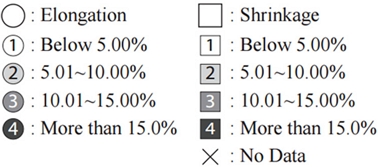 동작에 따른 체표면 길이의 변화율은, 기준자세(0°)의 구간별 가로, 세로 체표기준선의 평균값을 기준으로 동작에 따라 측정값의 변화량과 변화율을 나타내었다. 한 평면에 체표면 길이의 변화율을 볼 수 있도록 전개도를 작성하였다. 전개도는 무릎의 경우 바깥쪽 옆선(LS)을 기준으로 잘라 펼친 형태로 작성하였고, 고관절은 S21b에서 S7f로 펼친 형태로 작성하였으며 변화율 정도를 5.00% 이하, 5.01~10.00%, 10.01~15.00%, 15.00% 초과로 범위를 설정하여 4단계로 나누었다. 신장률은 원형(○), 신축률은 사각형(□)으로 표시하였다. 변화율을 가시적으로 보기 위해 도형의 명암을 달리하여 전개도에 표시하였으며 측정이 불가한 곳은 엑스표(×)로 표시하였다. 각 구간에 대한 신장률과 신축률을 전개도에 나타내어 신축도 도면을 작성하였으며, 이를 해석하였다.