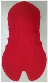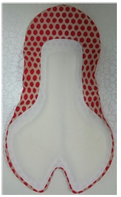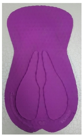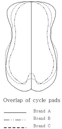 패드의 세부적인 사이즈를 살펴보면, 각 중심부의 Central length는 브랜드 A가 38.0 cm로 가장 길고, 브랜드 B와 C의 길이는 각각 34.4 cm, 34.0 cm로 비슷한 사이즈를 나타냈다. 패드의 너비에서는 Perineal은 브랜드 A가 20.8 cm, 브랜드 B는 14.0 cm, 브랜드 C는 16.0 cm로 나타났으며, Hip은 브랜드 A가 22.4 cm, 브랜드 B는 19.5 cm, 브랜드 C는 22.7 cm로 나타났다. 따라서, 브랜드 A는 직선형의 가까운 형태이고, 브랜드 B와 C는 앞부분과 뒷부분의 차이가 크며 곡선 형태로 회음부와 엉덩이에 밀착이 되도록 입체적인 모양으로 되어 있다. 또한, 가운데 쪽의 너비는 브랜드 B가 가장 작게 나타나 패드의 길이와 너비는 전체적으로 브랜드 B가 가장 작은 것으로 나타났다. 두께 부분을 보면, 브랜드 A는 전체 패드의 두께는 0.4 cm이고, 엉덩이 부분은 0.8 cm 두께의 폼을 덧대었다. 브랜드 B의 전체 패드 두께는 0.15 cm로 3개의 브랜드 중 가장 얇은 것으로 나타났고, 회음부에서 엉덩이에 이르는 폼의 두께를 0.4 cm에서 0.6 cm로 엉덩이 부분을 더욱 두껍게 덧대었다. 브랜드 C는 전체 패드의 두께는 0.2 cm이고, 브랜드 B와 마찬가지로 회음부에서 엉덩이 부분으로 폼의 두께를 0.5 cm에서 0.7 cm로 덧대었다. 또한, 좌골의 형태를 안정적으로 받쳐주기 위하여 Gap length, Angle에서 볼 수 있듯이 브랜드 A는 5.2 cm의 사이 간격, 높이 1.1 cm, 45도의 각도이고, 브랜드 B는 6.0 cm의 사이 간격, 높이 4.5 cm, 38도의 각도이며, 브랜드 C는 9.5 cm의 사이 간격, 높이 2.0 cm, 62도의 각도로 형성되어 있었다.