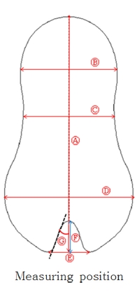 다음은 패드의 사이즈를 비교하기 위하여 세부 사이즈를 측정하였고, 측정 방법은 이태리 브랜드 기준으로 나타내었으며, YUKA CAD 프로그램으로 디지타이징하여 중심점을 기준으로 중합하여 크기를 비교하였다(Table 5).