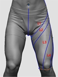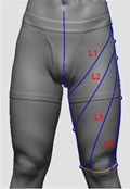 A dermatome is an area of skin that is mainly supplied by afferent nerve fibers from a single dorsal root of a spinal nerve which forms an area of a spinal nerve(Fig. 7). Along the thorax and abdomen, the dermatomes resemble a stack of discs forming a human, each supplied by a different spinal nerve(Dermatome, n. d). Dermatomes are regularly arranged on the body surface in each neuromere, along with the distribution of sensory and motor nerves (Kim, 2008). Iberall(1970) developed a method of mapping a nonstretching line on the body surface to create a variable pressure suit. This line of non-extension(LoNE) does not increase and keeps the appropriate pressure, but does not restrain the human body. In studies involving dermatomes, Kim(2008), in a basic research to develop functional clothing, analyzed the change of a dermatome according to dynamic posture and suggested a method for establishing construction lines of functional clothing. Choi and Hong (2015) provided a practical guide line for LoNE that depends on the length of the pants, and the LoNE of the lower body were investigated extensively. Quantification of deformation along the various curvature directions on the body surface is helpful for functional design lines and their fabrication using seams. One of the key variables affecting the performance and comfort of compression suits is the location and quality of the seams that join and assemble the pattern panels together(Choi & Hong, 2015). In recent years, the clothing industry has been paying more attention to user-customized clothing design in which computer-aided design(CAD) technologies speed up the design procedure and shorten the time taken from designing to fabricating, and 3D body scanning has become a revolutionary technology that is changing many aspects of the clothing industry(Zang et al., 2014). Three-to two-dimensional(2D) deployment is often used to make tight-fitting clothes. However, most of these designs are based on the static state, without considering the dynamic state. Pattern manufacturing has focused on a standard body type for most clothing patterns without providing a proper fit for each individual body shape. To enhance the fit of clothing, it is necessary to incorporate the subtle features of body shape and posture in clothing patterns(Choi & Nam, 2009). In a study that reflects dynamic posture in relation to cycling wear, Luo et al.(2017) obtained the lower body skin deformation map using the gel rubbing method. The study proposed a reliable and convenient method to procure skin deformation for active body postures. The results provide primary data for pattern designers to determine suitable ease distribution, reasonable divisions of clothing patterns and matching elastic fabric for each division of cycling shorts. Liu et al.(2016b) used 3D-to-2D flattening technology to develop patterns of a jersey T-shirt. A novel pressure measuring method was proposed to test the clothing pressures in static and dynamic states in a virtual environment. Park and Kim(2019) analyzed the changes in body surface by road bike driving motion through 3D human body scanning. The standard pattern was modified by consideration of body surface change analysis and motion suitability, and the final pattern was suggested through electroencephalogram(EEG) analysis. However, these studies were not aid at the development of automatic pattern-making systems or the improvement of athletic performance of professional athletes. There are many problems in applying these studies to cyclists because the difference in garment pressure between the static and dynamic states were studied using the pattern of the static state. Our body dimensions and shapes change as we move. The dimensions measured during dynamic states provide information regarding adjustments that can be made to clothing to facilitate ease of motion(Shin & Chun, 2013). Additionally, even for garments made of the same material, there is a difference in fit depending on the cutting line, which is determined in the design construction of the clothing. Thus far, there has been no exploration of skin deformation of the lower limbs in the cycling posture for cyclists. Therefore, we aim to develop compression cycling tights, observe changes in the body surface for cycling dynamic posture, and apply the dermatome to improve athletic performance. Customers’ demand for better fitting clothing is increasing in today’s clothing market, and clothing companies are increasingly interested in providing customized clothing as a new and unique way to market their clothes. Accordingly, if more efficient and automated methods for making individually customized patterns are developed, this may facilitate the provision of individual customization of clothes(Han et al., 2014).