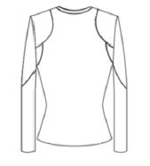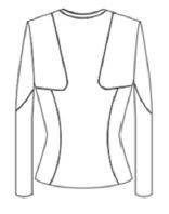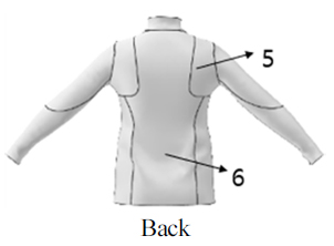 연구제품의 구성선은 의복표면온도가 가장 높은 부위로 설정하여 흡수성이 높은 소재를 사용하였다. F1 부위의 디자인은 윗가슴선과 앞 목둘레선을 연결하여 구성선을 설계하고 연구제품을 제작한 결과, 외관평가에서 낮은 평가를 받아 윗가슴선부터 진동깊이선 4 cm 내려온 지점까지 확장하여 설계하였다. B5 부위의 디자인은 견갑골부위만 구성선을 설계하여 제작한 결과 외관평가에서 낮은 평가를 받아 시각적인 효과를 높이기 위하여 견갑부위보다 확장하고 진동깊이선에서 4 cm 내려온 지점까지 수정하였다. S1 부위의 디자인은 삼각무로 절개선을 넣어서 구성하였으나 좋은 평가를 받지 못하여 S1~S4 부위 옆패널(앞, 뒤) 모두 요크 선 밑으로 프린세스라인을 설계하여 허리선이 더 슬림해 보이면서 자연스럽게 밀착되도록 제작하였다. 상의 길이는 외관평가 결과를 반영하여 56 cm에서 68 cm로 수정하였다(Table 3). Table 4는 연구제품의 1차, 2차 상의디자인 도식화이다.