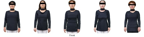 피험자는 3년 이상 댄스스포츠 운동을 지속하고 있으며 사이즈 코리아 ‘제 7차 인체 치수조사’에서 제시하는 40~50대 여성의 평균 사이즈 ±S.D 범위에 속하는 5명을 대상으로 하였다(Table 1). 본 논문에 사용된 댄스스포츠 상의 디자인 시안은 선행연구(Jun et al., 2020)에서 제시하였다.