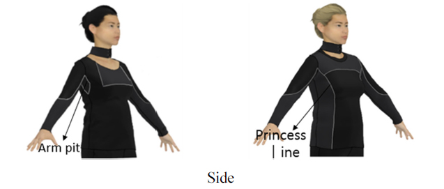 냉감기능성 댄스스포츠 상의 개발을 위하여 선행논문(Jun et al., 2020)의 댄스스포츠 운동 후 의복표면온도 변화, 냉감소재의 물성, 냉감도구의 선호도를 반영하여 연구제품을 제작하였다. 먼저 중년 여성 아바타로 설정된 가상착의 시스템을 이용하여 연구제품을 착의시켰으며 그 결과를 수정 보완하여 연구제품을 제작하였다(Fig. 4).