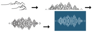 Work 2 (a)의 반복단위는 Table 3에서 Image 2의 백자청화산수무늬항아리에 표현된 첩첩산중의 이미지를 90° 반시계방향으로 회전한 다음 그것을 상하 반전한 것이다. 그것을 세로방향으로 1/2씩 서로 엇갈려 이동시켜 배열하여 (b)의 패턴을 완성하였다. 모티브를 세로방향으로 배열한 다음, 그것을 1/2씩 엇갈려 배열하여 변화성을 느낄 수 있도록 하였다. 또한 산맥의 선을 겹겹이 표현함으로 인하여 고급스러운 분위기를 표현하고자 하였다. 산맥으로 표현된 선에는 고명도의 청록색계열 그리고 배경에는 중명도의 청록색계열의 유사색상을 사용함으로써 통일감과 함께 편안함을 나타내고자 하였다. (c)는 (b)의 직물 패턴디자인을 자동차시트에 맵핑한 것으로, 이를 통하여 세련된 직물 패턴디자인의 이미지와 자동차시트 이미지와의 조화를 확인하고자 하였다(Fig. 27).