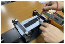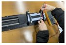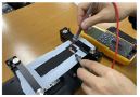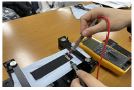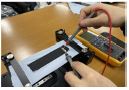 센서의 위치는 Fig. 7과 같이 무릎 부위는 센서의 방향이 사선일 때 스트레치 정도가 큰 결과값을 보이므로 사선으로 위치를 정하고, 엉덩이 부위는 양쪽 엉덩이 중앙에 수직으로 위치를 정하였다. 센서와 기기부를 연결하는 전선은 세탁과 스트레칭이 가능한 기능성 섬유 개발 업체인 Kazhtex의 제품을 사용하였으며, 전선과 MWCNT 센서의 부착 방법은 내구성과 세탁을 고려하여 Fig. 8과 같이 열코팅하였다.