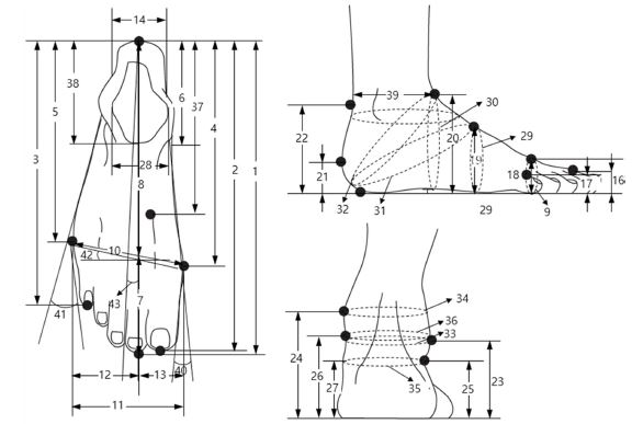 본 연구는 비만 남성의 발 특성을 파악하기 위하여 제8차 Size Korea(KATS, 2020~2021)의 20~69세 성인 남성 1,999명의 3차원 발 측정 데이터를 활용하였다. 제8차 Size Korea(KATS, 2020 ~2021) 인체치수조사 보고서의 체질량지수(BMI)를 기준으로 한 비만평가에 따라 18.5~22.9 kg/m2는 표준체중, 23.0~24.9 kg/m2는 위험체중, 25.0~29.9 kg/m2은 1단계 비만, 30.0 kg/m2 이상은 2단계 비만으로 설정되어 있으나, 본 연구에서는 25.0 kg/m2 이상을 비만 집단군으로 나누어 분류하였으며 BMI 18.4 kg/m2 미만에 해당하는 저체중(1.3%)을 제외한 1973명의 3차원 발 측정 데이터를 최종 분석자료로 활용하였다. 발의 특성 분석을 위한 발 측정 항목은 제8차 Size Korea의 측정 항목에 따라 길이 10항목, 높이 12항목, 둘레 9항목, 두께 및 너비 8항목, 각도 4항목, 계산치 1항목으로 총 44개의 항목으로 설정하였다(Table 1).