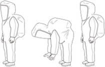 • ③ 똑바로 서서 양팔을 양 옆구리에 바로 둔 자세에서 몸을 왼쪽으로 굽히고(5초 유지), 다시 정자세로 돌아온다. 몸을 앞으로 구부리고(5초 유지), 다시 정자세로 돌아온다. 몸을 오른쪽으로 구부리고(5초 유지), 다시 정자세로 돌아온다.
