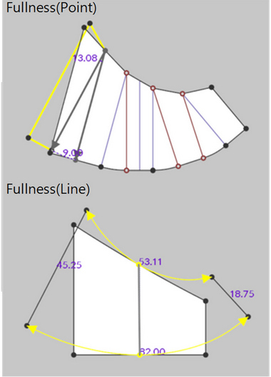 CLO에서는 ‘패턴벌리기(점)’과 ‘패턴벌리기(선분)’ 툴을 이용하여 플레어 분량을 추가할 수 있다. ‘패턴벌리기(점)’ 툴은 지정한 선분의 한쪽 끝을 벌리며 패턴을 잘라서 벌린 것과 유사한 결과를 보인다. YUKA의 ‘편측절개’와 유사하지만, 절개선을 한개씩 선택할 수 있어서 복수의 절개가 필요한 경우 반복 작업이 필요하다. ‘패턴벌리기(선분)’은 늘릴 선분과 기준 선분의 길이를 입력하여 플레어 효과를 만드는 툴이다. YUKA에서 ‘편측절개’한 후, 분리된 선분을 합치기한 것과 같은 결과를 보이지만 절개선을 선택할 수 없다(Table 9).