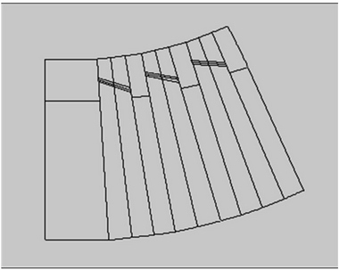 YUKA의 ‘외주름’ 메뉴를 이용하면 플리츠 분량을 생성할 수 있다. 플리츠 분량을 생성할 선분을 선택하고 상단절개량과 하단절개량의 분량을 입력하여 다양한 플리츠를 생성할 수 있다(Table 10).