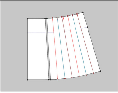 YUKA의 ‘편측절개’ 메뉴를 이용하면 선분을 기준으로 절개하여 한쪽만 벌려서 플레어 효과를 표현할 수 있다. ‘편측절개’는 머메이드스커트의 하단부와 같이, 플레어가 필요한 패턴 제도에 유용하다. YUKA에서는 편측절개를 이용하여 스커트 하단 부분을 벌리고, 절개된 선분들을 ‘합치기’하여 플레어가 추가된 패턴을 완성할 수 있다(Table 9).
