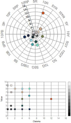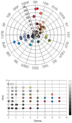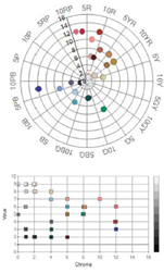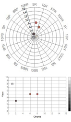 메트로폴리탄 뮤지엄의 색상분포를 보면 빨강 계통과 연두 계통, 파란 계통에서 고채도, 중명도의 선명한 색상이 많이 분포하였으며, 주황, 노랑, 초록, 보라에서 중채도의 고명도와 저명도 제품이 많이 나타나고 있었다(Image3, Image 4). 이는 국외에서는 어느 한 색상이나 색조에 치우치지 않고 다양한 색상과 색조의 스카프가 판매되고 있다는 것을 보여준다.