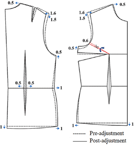 본 연구는 부위별 맞음새 평가 결과에서 2.5점 이하의 점수를 받은 항목에 대해 패턴 수정을 진행하였다. 유형 1의 경우, 옆선 수직정도의 맞음새 점수만 2.16으로 낮게 나타났다. 그러나 가슴, 허리, 엉덩이 부위의 여유분이 적당하고 옆선이 몸에 수직으로 위치하지는 않지만 각 부위의 두께의 중간 정도에 위치한 것으로 파악되어 수정을 진행하지 않았다.