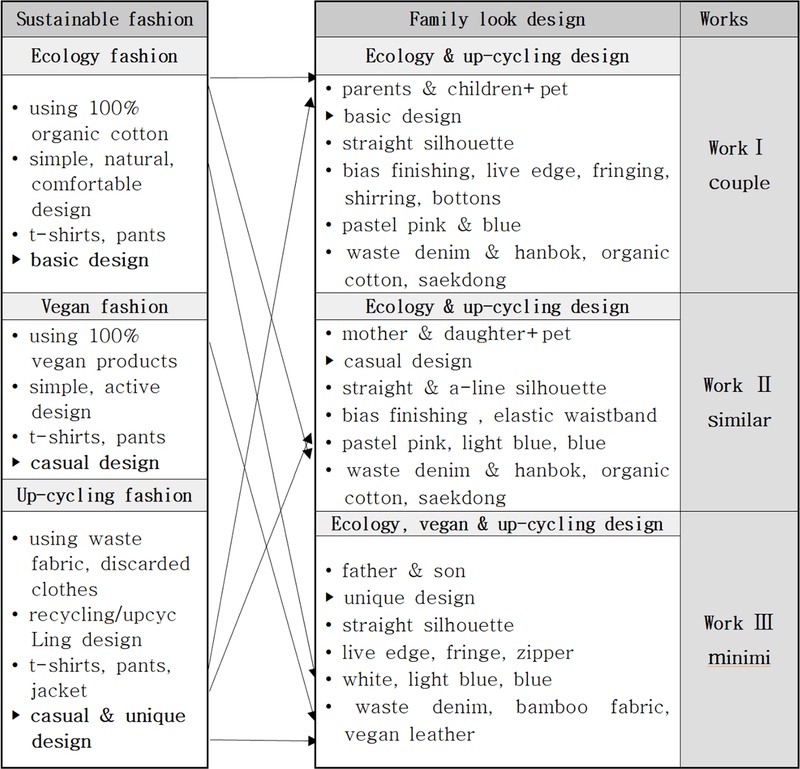 이러한 분석 결과는 본 연구에서 하고자 하는 지속가능 패밀리룩 디자인 개발 시 베이직, 캐주얼, 유니크 디자인 설정의 근거가 되었다. 패밀리룩 디자인의 특성을 반영하여 베이직하면서도 캐주얼하고 현대적 감각이 돋보이는 유니크한 디자인을 추구했으며, 컨셉을 커플, 시밀러, 미니미로 정하고 총 10점의 디자인을 개발하였다. 각 작품은 친환경 및 업사이클링 패션의 특성을 반영하여 다양한 소재와 폐부자재의 디테일을 적용하였다.