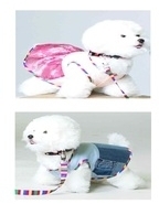 작품 II는 엄마와 딸, 반려동물이 일상에서 편하게 착용할 수 있는 시밀러 컨셉의 캐주얼한 패밀리룩으로 친환경 및 업사이클링 패션의 특성을 반영하여 디자인하였다. 전체적인 색상은 데님 블루톤으로 통일감을 주었으며, 폐데님과 폐한복을 주요 소재로 활용하였다. 엄마의 의상은 언발런스 스트레이트 실루엣의 랩 원피스이며, 한복 문양으로 포인트를 주었다. 허리끈의 리본을 한복의 옷고름처럼 보이도록 길게 제작하여 한국적인 분위기를 더했으며, 폐한복 안감으로 속치마를 제작해 비침을 해결하여 실용성을 높였다. 딸의 의상은 여유 있는 A라인 슬리브리스 원피스에 반소매 볼레로로 구성하여 가장자리에 폐데님과 폐한복으로 바이어스 장식하였다. 원피스의 편리한 착용을 위해 등 부분 V자 절개와 탄성 밴드를 부착하였다. 반려동물 의상은 배변의 편의를 위해 일체형 원피스이며, 오물 봉투나 소지품 보관용의 미니 포켓을 제작하였다. 특히, 자투리 색동원단으로 만든 목줄로 우리나라 고유 전통의 ‘오방색’을 체험할 수 있도록 하였다(Table 5).