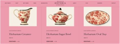 연속성과 다양성은 아르마니 호텔 외에도 디올, 프라다, 구찌의 F&B 공간과 연계된 라이프스타일 제품군에서도 확인된다. 세 브랜드 모두 자사의 카페 또는 레스토랑에서 사용하는 식기류 및 테이블웨어를 공식 온라인 채널을 통해 판매하고 있으며, 오프라인 공간 경험과의 연계를 통해 브랜드 내러티브를 상업 제품으로 확장하고 있다. 디올과 구찌의 카페를 방문하는 소비자들은 브랜드의 라이프스타일 제품군에 노출되며(Image 21, Image 25), 이를 통해 브랜드의 스토리텔링을 경험하게 된다. 디올 메종에서는 다양한 패턴의 식기류가 판매되고 있으며 (Image 22), 일부는 디올 카페에서 직접 제공된다. 또한 구찌 오스테리아 웹사이트에서도 레스토랑과 연계하여 고급 식품군이나 식기류를 판매함으로써, 오프라인 공간 경험과 연계된 브랜드의 미학적 내러티브를 온라인 유통 채널로 확장하고 있다 (Image 26). 이와 유사하게, 런던과 싱가포르에 위치한 프라다 카페는 프라다의 시그니처 컬러인 민트 그린과 체크 패턴 대리석을 인테리어에 반영하고 있다(Image 23). 이와 같은 시각적 요소들은 브랜드의 공간 경험을 각인시키는 동시에, 동일한 색상과 패턴을 기반으로 한 글라스웨어와 테이블웨어 제품군이 프라다 공식 웹사이트에서 판매되고 있다(Image 24). 이는 공간 경험과 상업 제품 간의 내러티브적 연계를 통해 소비자가 브랜드의 확장을 다층적으로 경험하도록 유도하는 효과적인 방식이라 할 수 있다.