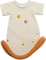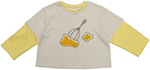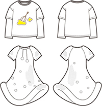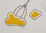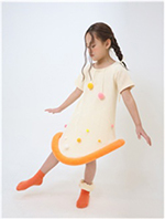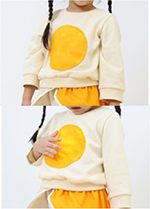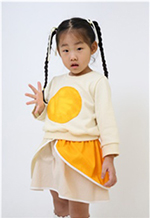 2단 소매 티셔츠에 촉감이 재미있는 스펀지 프린팅을 더한 소재 중심 디자인이다. 소재는 착용이 편안하고 스펀지 프린팅 부착이 가능한 Cotton Poly 소재를 사용하였으며, 스펀지 프린팅 가능한 색상이 단일 컬러(노란색)이라는 점을 고려하여 옐로우 계열 컬러를 선택하였다. 놀이 교구 요소 역할을 하는 스펀지 프린팅은 시각적 즐거움과 호기심을 유발하고자 생크림의 곡선적 형상을 떠올릴 수 있게 디자인하였다. 유아는 크고 작은 스펀지 프린팅을 누르며 촉감 놀이로 활용할 수 있고, 본 연구는 유아가 스펀지의 성질을 탐구하며 감각, 인지, 정서의 통합적 발달을 경험하는 것을 기대하였다.
