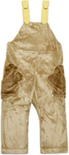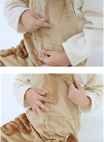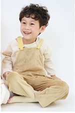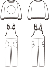 두 개의 아웃포켓이 있는 사이드 지퍼 오픈 오버롤 디자인으로, 결이 살아있는 벨보아 소재와 퍼 소재를 사용하여 결의 방향에 따른 컬러 변화를 탐색하며 놀이할 수 있는 컬러 중심 디자인이다. 본 연구에서는 소재의 결과 색상 변화가 뚜렷하게 보이는 브라운 계열 색상의 3mm 벨보아 소재를 몸판에 사용하여 디자인하였으며, 소재의 결에 따른 색상 변화의 인지를 놀이 교구의 요소로 고려하였다. 대부분의 유아는 만 2세를 전후해서도 쓰기가 가능한 곳이면 어디든지 낙서를 하는 경향을 보이며, 만 2.5~3세 사이에 수직선이나 수평선, 원 모양을 따라 그리는 모습을 보이다가 그리기 능력은 만 3~4세에 나타난다(Park, 2005). 결이 살아 있는 소재는 유아의 촉각을 자극하며, 동시에 결을 살려 글을 쓰고 그림을 그리는 등의 활동이 가능하여 즐거움을 준다. 이러한 의복에는 발달이 더뎌 연필 잡기가 어려운 유아도 손가락을 통해 그림을 그릴 수 있으며 손동작에 따라 달라지는 소재의 결과 색상을 확인하는 것 자체로도 즐거운 놀이가 될 수 있다. 오버롤의 어깨 끈의 경우 벨크로를 활용한 모듈형 끈으로 디자인하였고, 구멍이 있어 끝을 통과시키고 양방향에서 벨크로로 고정할 수 있게 제작하였다. 이러한 디자인을 발전시키면 유아가 다양한 길이와 색상의 모듈형 끈을 선택하고 조립하며 창의적인 형태를 만드는 경험을 하여 오버롤의 어깨끈 또한 놀이 교구의 역할을 하는 것을 기대할 수 있다.