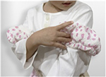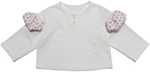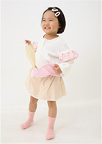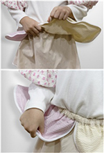 앞 단추 여밈 티셔츠의 소매에 벨크로를 사용하여, 소매 장식을 탈부착 할 수 있는 조작의 여지를 담은 형태 중심 디자인이다. 티셔츠는 유아가 착용하기 편안한 촉감의 Cotton Poly Span 소재를 사용하였으며 소매 장식이 달렸을 때 형태 무너짐이 없도록 비교적 탄탄한 소재로 선택하였다. 또한 다양한 소재 장식이 어울릴 수 있도록 티셔츠는 기본적인 화이트 컬러로 선택하여 디자인하였고, 소매 장식은 아동과 어머니의 선호도가 높은 퍼프 형태로 만들었으며(Yang, 2015) 유아의 감각 체험을 고려하여 티셔츠와 구별되는 입체적인 소재를 사용하였다. 탈부착 소매 장식은 옵셔널한 아이템으로 본 연구에서는 티셔츠와 구별되는 핑크 컬러로 제작하였다. 놀이 교구의 요소와 관련하여 유아는 소매 장식을 선택하고 스스로 탈부착하는 과정에서 의복으로 놀이할 수 있으며, 본 연구에서는 소매 장식의 소재와 디자인에 따라 다양한 감각과 미적 감수성을 자극하는 것과 벨크로를 활용하여 옷의 형태를 적극적으로 바꾸면서 소근육 발달과 자율성 신장을 촉진하는 교육적 효과를 기대하며 디자인했다.