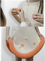 무릎 기장의 반소매 원피스의 밑단에 메모리폼을 삽입하고 장식 요소를 더한 소재 중심 디자인이다. 메모리폼은 손자국이 남았다가 서서히 복원되는 형상이 관찰되도록 저탄성으로 선택하였으며, 누르거나 만지고 복원되는 모습을 지켜보는 것을 하나의 놀이로 생각하였다. 밑단은 너무 무겁지 않도록 조절하여 패턴 작업을 진행하였고, 소재는 부드럽고 따뜻한 촉감의 골지 벨로아로 선택하여 유아가 편안하게 착용하고 원피스의 곳곳을 만져보며 촉감을 탐구하는 것을 목표로 디자인했다. 또한 다양한 소재의 경험이 가능하도록 장식적인 요소를 추가하였고 생동감 있는 디자인에 어울리도록 오렌지 및 멀티 컬러를 활용하였다.