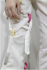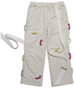 레귤러한 핏의 팬츠에 두 개의 끈과 다양한 컬러의 벨트 고리를 부착하여 조작의 여지를 더한 디테일 중심 디자인이다. 유아가 더 많은 색채 경험을 할 수 있도록 다양한 컬러의 벨트 고리를 부착하였으며, 밟거나 걸려 넘어지지 않도록 끈 길이를 길지 않게 조절하였다. 또한 편안한 착용감의 Cotton 소재를 사용하고, 앉을 때 불편함이 없도록 벨트 고리는 앞판과 사이트 라인에만 위치시켰다. 유아는 자유롭게 상상하며 두 개의 끈을 조작하거나 묶고, 배치할 수 있으며, 본 연구에서는 그러한 과정을 통해 유아가 상상력과 창의성을 키우고 스스로 조작 및 탐색하며 소근육 발달과 자조기술을 습득하는 것을 기대하며 디자인했다. 다양한 벨트 고리를 통과하고 끈을 가지고 노는 과정 자체가 의복 놀이이며, 벨트 고리와 끈은 놀이 교구의 요소를 지닌 디테일로 재해석되었다.