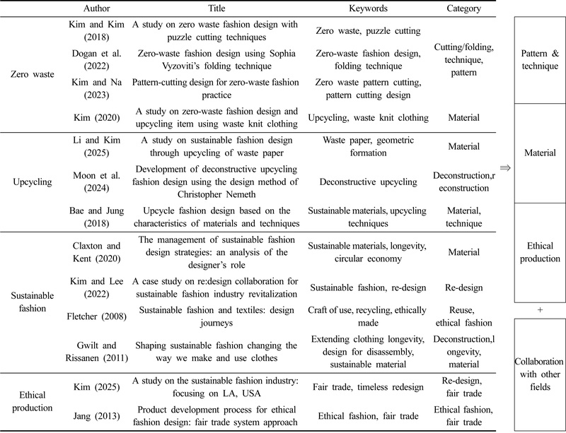 Previous studies on sustainable fashion have been conducted primarily in the areas of ‘zero waste,’ ‘up-cycling,’ ‘sustainable fashion,’ and ‘ethical production’ (Table 1).
