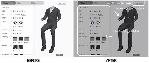 번호①은 정장 맞춤 페이지 내비게이션 바 영역으로써 디자인, 소재, 사이즈 순서대로 진행되는 현재 페이지의 위치를 표시하도록 음영의 처리를 달리하였으며 각각 버튼으로써 페이지이동 역할을 설정하였다. 번호②는 실시간 가격 표시 영역으로써 디자인, 소재 옵션에 따라 실시간 가격변동 표시, 텍스트의 크기를 14포인트로 크게 설정하여 가독성을 높였다. 번호③는 정장 스타일 옵션 영역으로써 단추 수, 재킷 길이 등 18종의 정장 스타일을 이미지와 그래픽, 텍스트 적절히 사용하여 이해도를 높였다. 특히 휠체어 사용자를 위한 선택항목으로 뒷주머니, 앞주머니 유/무, 카데타 주머니, 의족착용을 위한 밑단지퍼 등 5가지 항목이 포함되었다. 번호④는 실시간 시뮬레이션 아바타 표시 영역으로써 옵션의 선택에 따라 실시간으로 이미지가 변화되어 구매자가 맞춤정장 모습을 확인할 수 있게 하였다. 아바타의 모습은 비장애인과 달리 앉아있는 시간이 대부분인 휠체어 사용자의 생활패턴을 고려하여 앉아있는 모습으로 디자인하였다. 또한, 2D의 이미지보다 현실감 있는 아바타의 모습을 위하여 3D CLO 프로그램을 활용한 3D 입체 아바타 이미지를 구현하였다.