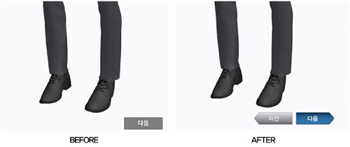 본 연구는 휠체어 사용자의 효용성 검증에서 도출된 개선안에 따라 Table 6과 같이 보완하여 휠체어장애인 온라인 남성정장 맞춤시스템 유저인터페이스를 완성하였다. 심미성 측면에서 구성개채 간 여백을 줄여 한 페이지에 모든 정보가 한눈에 보이도록 조정하였으며, 접근성 측면에서 맞춤정장 페이지에서 사전에 안내 팝업 가이드를 띄우는 기능을 적용하였다. 오류예방성 측면에서는 데이터 입력기능을 사용하는 사이즈 입력 페이지에서 사전에 팝업 가이드를 띄워 정확한 사이즈 입력에 대한 도움말을 출력하였으며, 정보성 측면에서 자주 사용하는 메뉴의 가시성을 높이기 위해 “이전”과 “다음”버튼을 입체적으로 바꾸었다.