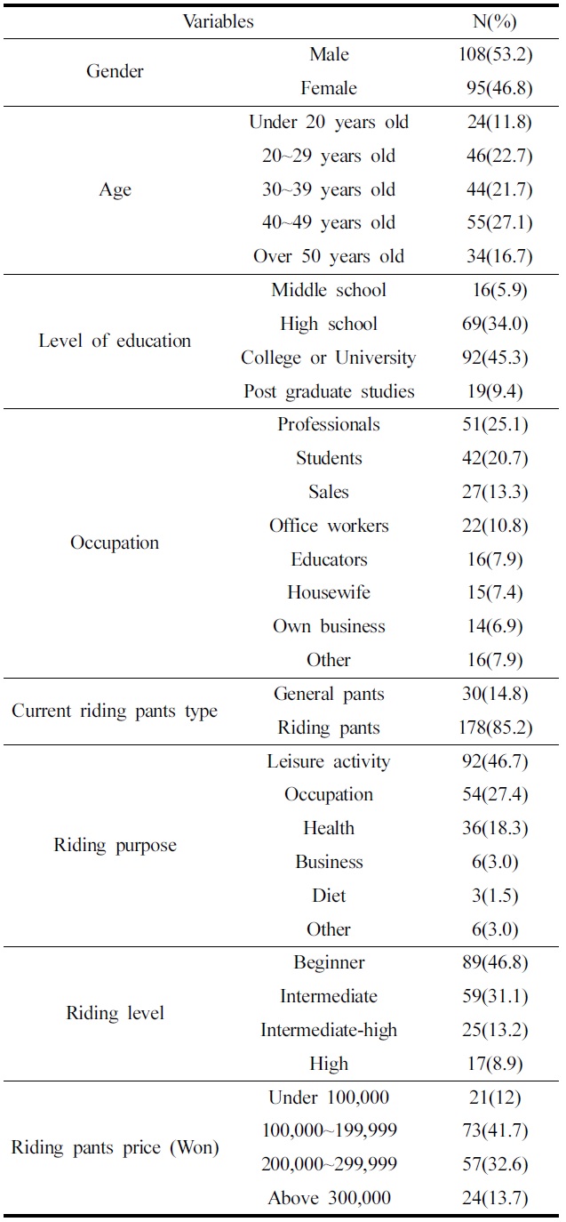 조사대상자의 평균 승마경력은 4년으로 나타났으며, 조사대상자의 대부분이 승마 시 승마바지를 착용(85.2%)하는 것으로 나타났다. 승마를 하는 목적으로 여가활동이 92명(46.7%)로 가장 많았고, 다음으로 직업상 54명(27.4%), 건강관리 36명(18.3%) 순으로 나타났다. 국내에서는 아직까지 건강관리 차원보다는 여가활동 목적으로 승마를 즐기고 있음을 알 수 있다. 조사대상자의 직업으로 전문직이 51명(25.1%)으로 가장 많았고, 다음으로 학생이 42명(20.7%), 판매직이 27명(13.3%), 사무직이 22명(7.9%)의 순으로 나타났다. 조사대상자 중 89명(46.8%)이 자신의 승마실력이 초보(46.8%)라고 응답하였고, 다음으로 중급(31.1%), 중-고급(13.2%), 고급(8.9%)의 순으로 응답하였다. 조사대상자의 73.4%가 100,000원대 승마바지를 구매하는 것으로 나타났고, 다음으로 200,000원대(55.4%), 300,000원 이상(24.4%), 100,000원 미만(21.3%)의 승마바지를 구매하는 것으로 나타났다.