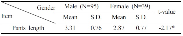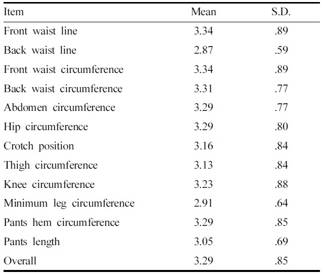 성별에 따른 승마바지의 치수 만족도를 분석한 결과, ‘바지길이’(p<.05)에서만 유의한 차이가 나타났다(Table 3). 여성이 남성에 비하여 상대적으로 ‘바지길이’ 치수 만족도가 낮은 것으로 나타났다. 이는 대부분의 승마바지는 ‘허리둘레’만 기준치수로 설정되어 여성의 다양한 하반신 길이를 반영하지 못하기 때문이라고 생각된다. 이는 선행연구(Kim, 2001)에서 수선이 쉽지 않은 엉덩이둘레나 허리둘레를 기준으로 바지를 구입하므로 바지길이가 긴 경우가 대부분이라는 것과 유사한 결과라고 할 수 있다. 그러므로 한국 성인 여성의 다양한 하반신 체형에 따른 바지길이를 반영할 수 있도록 여성용 승마바지 치수체계의 개선이 필요함을 확인하였다.